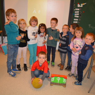 Liam nous a présenté son activité sportive à partir d'un PowerPoint au top et d'accessoires bien imaginés. Notre joueur de foot s'est exprimé avec un vocabulaire très précis. Pour ce champion, les copains ont repris en cœur la Brabançonne.